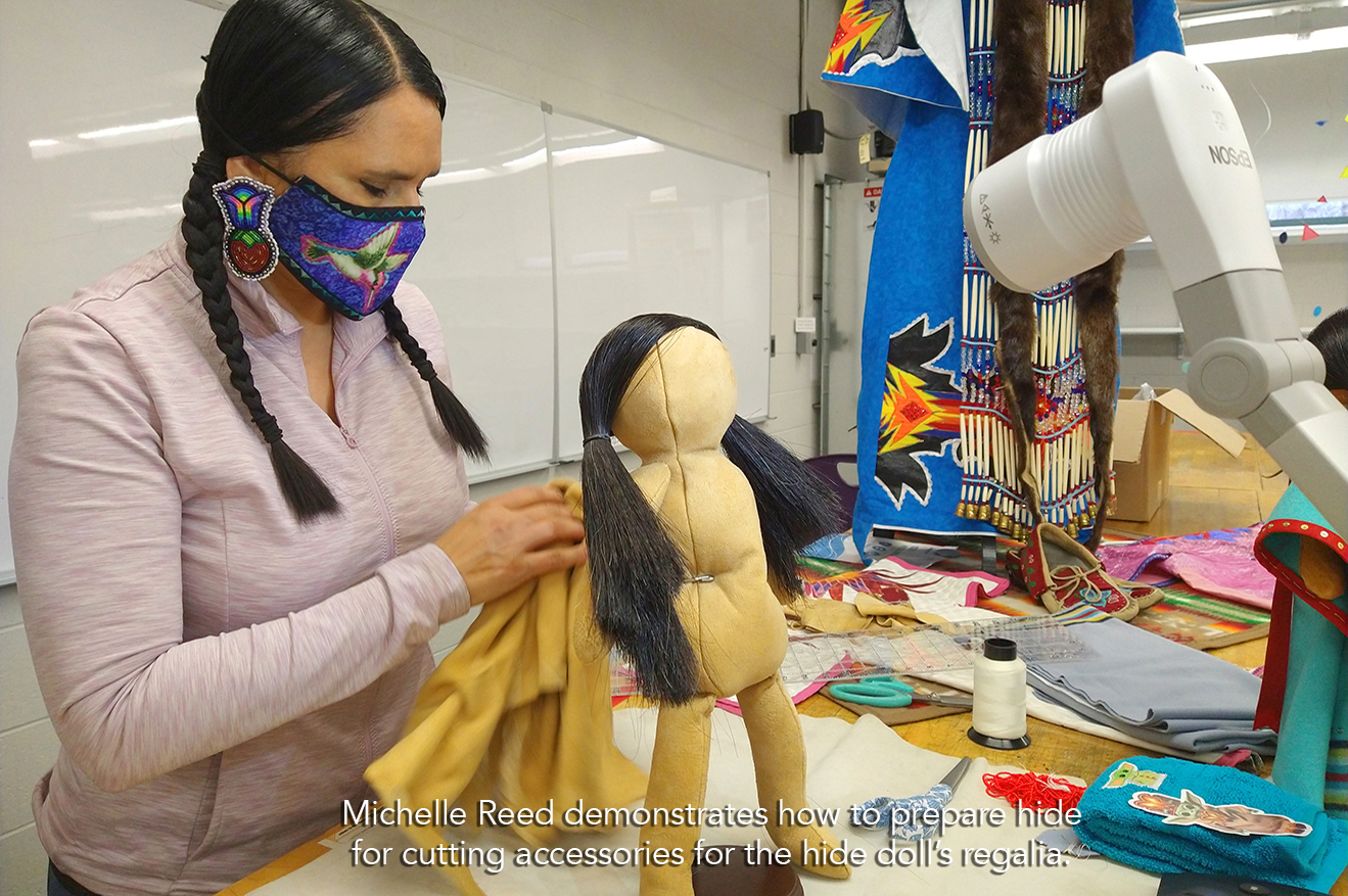 students both in-person and virtually to make an 18-inch hand-stitched hide doll in